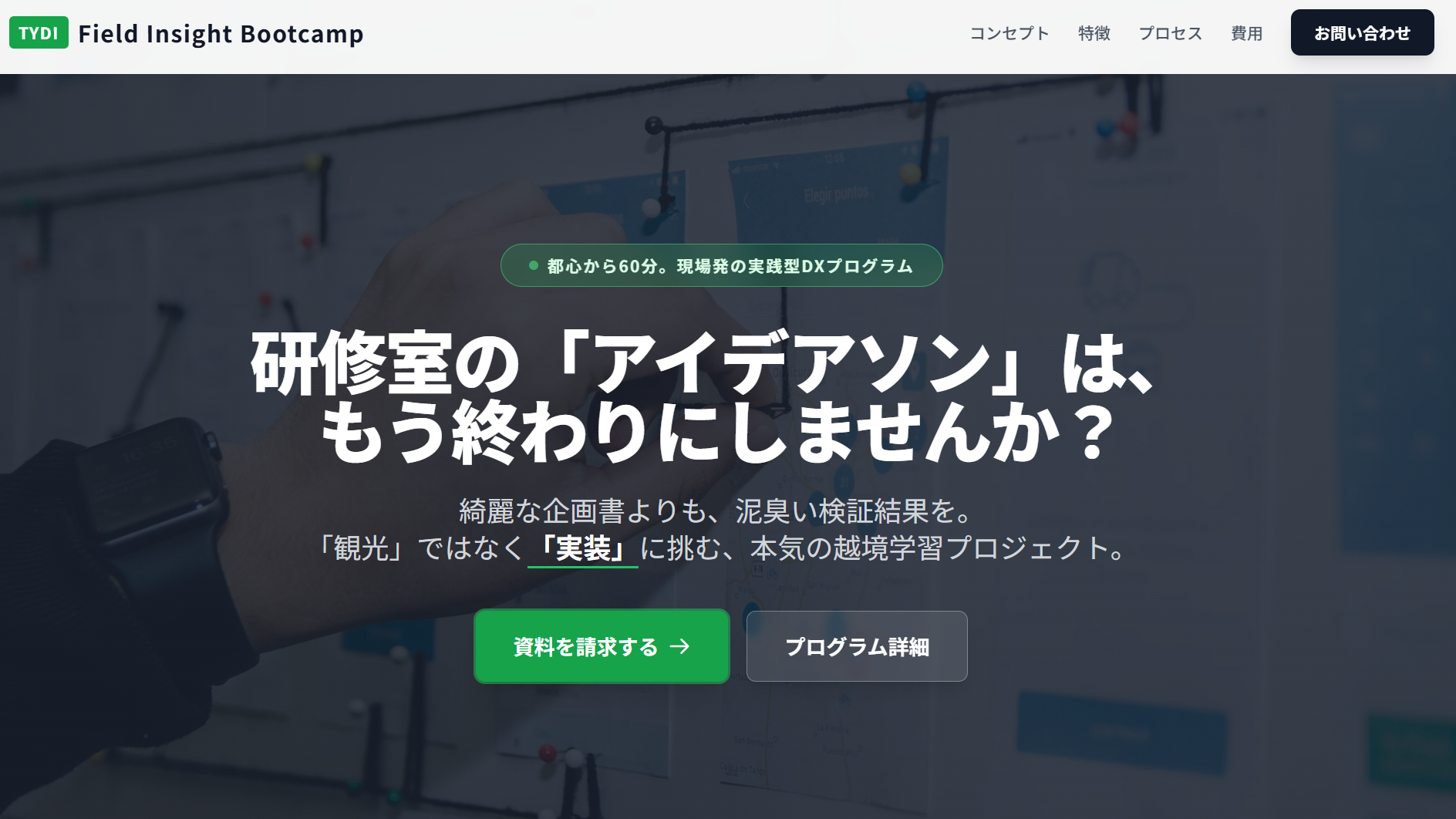 東京山側には、少子高齢化、担い手不足、事業承継、獣害、防災、観光、医療・介護、行政手続き、地域交通など、郊外・地方部と同型の課題が、生活者・事業者の現場として立ち上がっています。ここでは机上の市場調査では掴めない「なぜそうなるのか」「本当の不便はどこか」「誰が意思決定者か」といった一次情報が取れます。