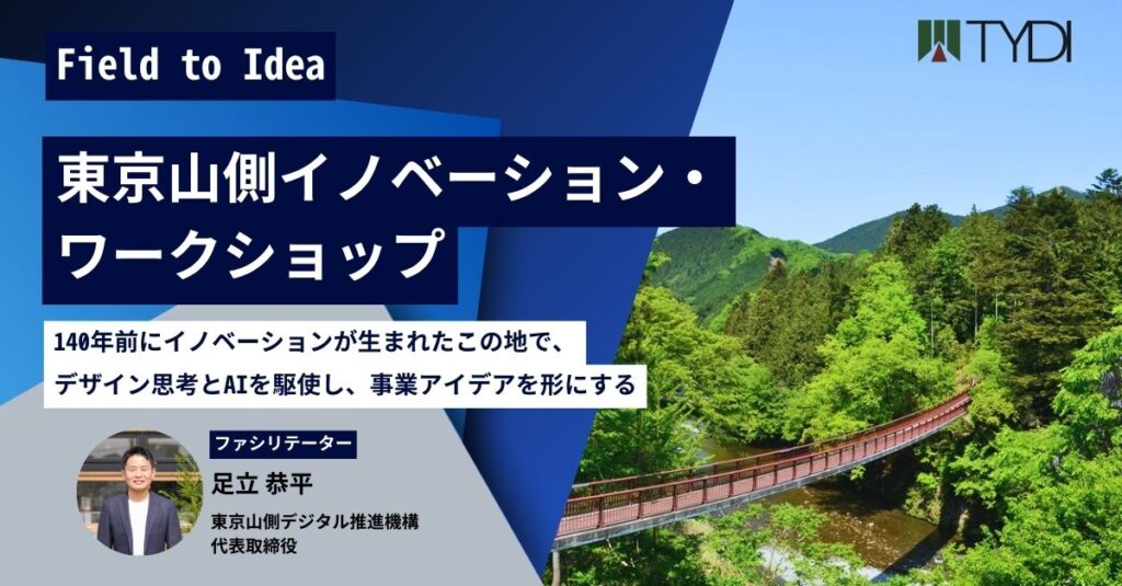 「Field to Idea|東京山側イノベーション・ワークショップ」は、新規事業・DX・事業開発に携わる方のための1Day実践プログラムです。東京・あきる野市でのフィールドワークと、デザイン思考・生成AIの活用を通じて、現場起点のアイデアを当日中にピッチ資... -